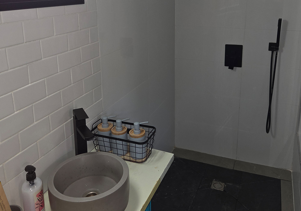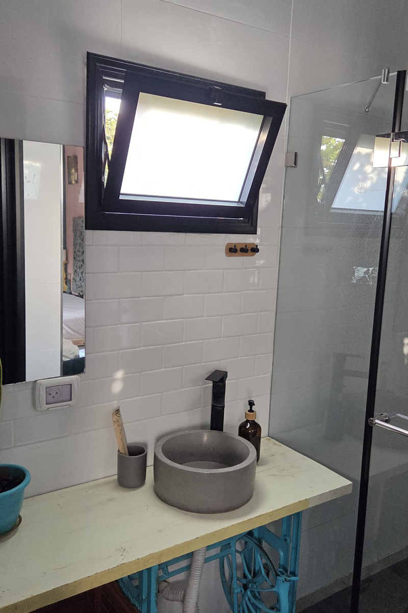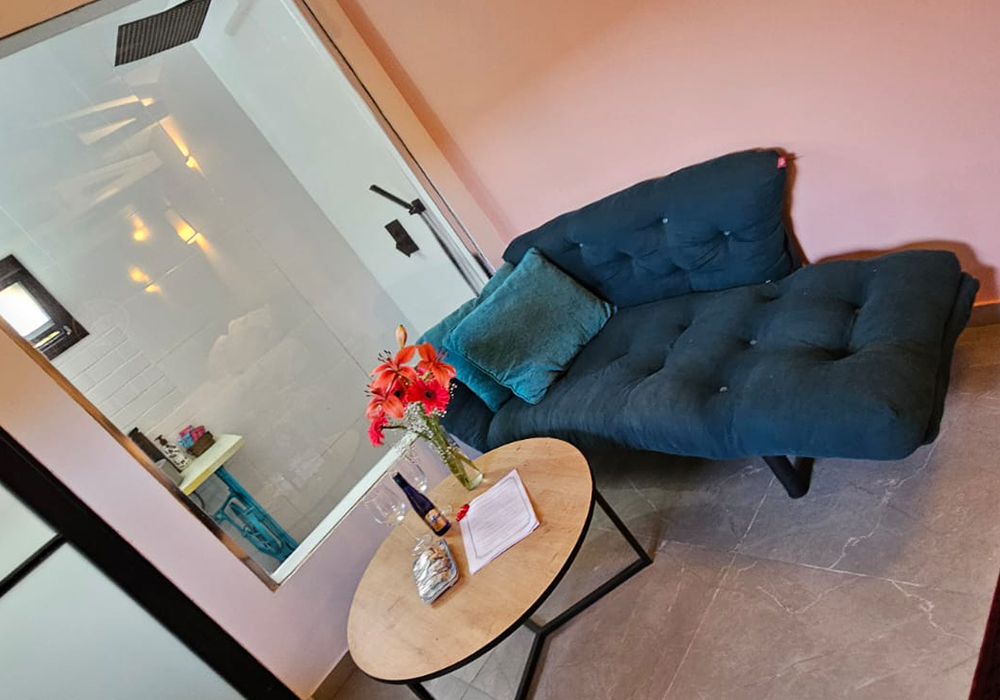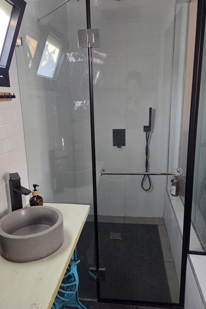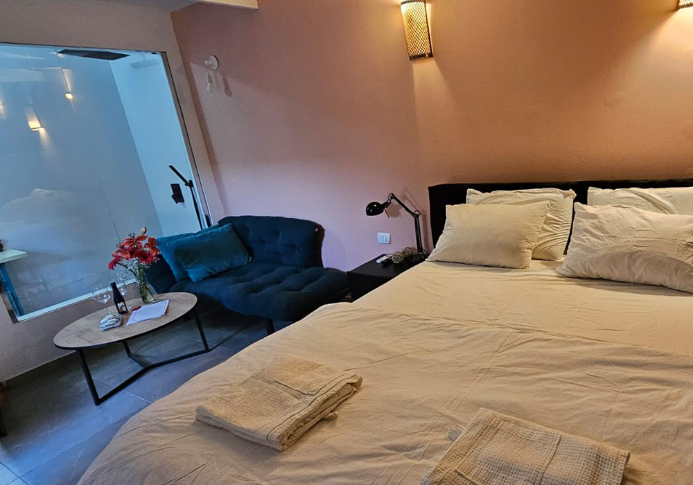 היחידה כוללת מקלחת שקופה בעיצוב ייחודי, המוסיפה נופך חושני ורומנטי במיוחד – חוויה אינטימית המתאימה לזוגות שאוהבים קרבה, פתיחות וקסם. האור המשתקף דרך הזכוכית יוצר משחקים עדינים של אור וצל, שהופכים כל רגע למיוחד.